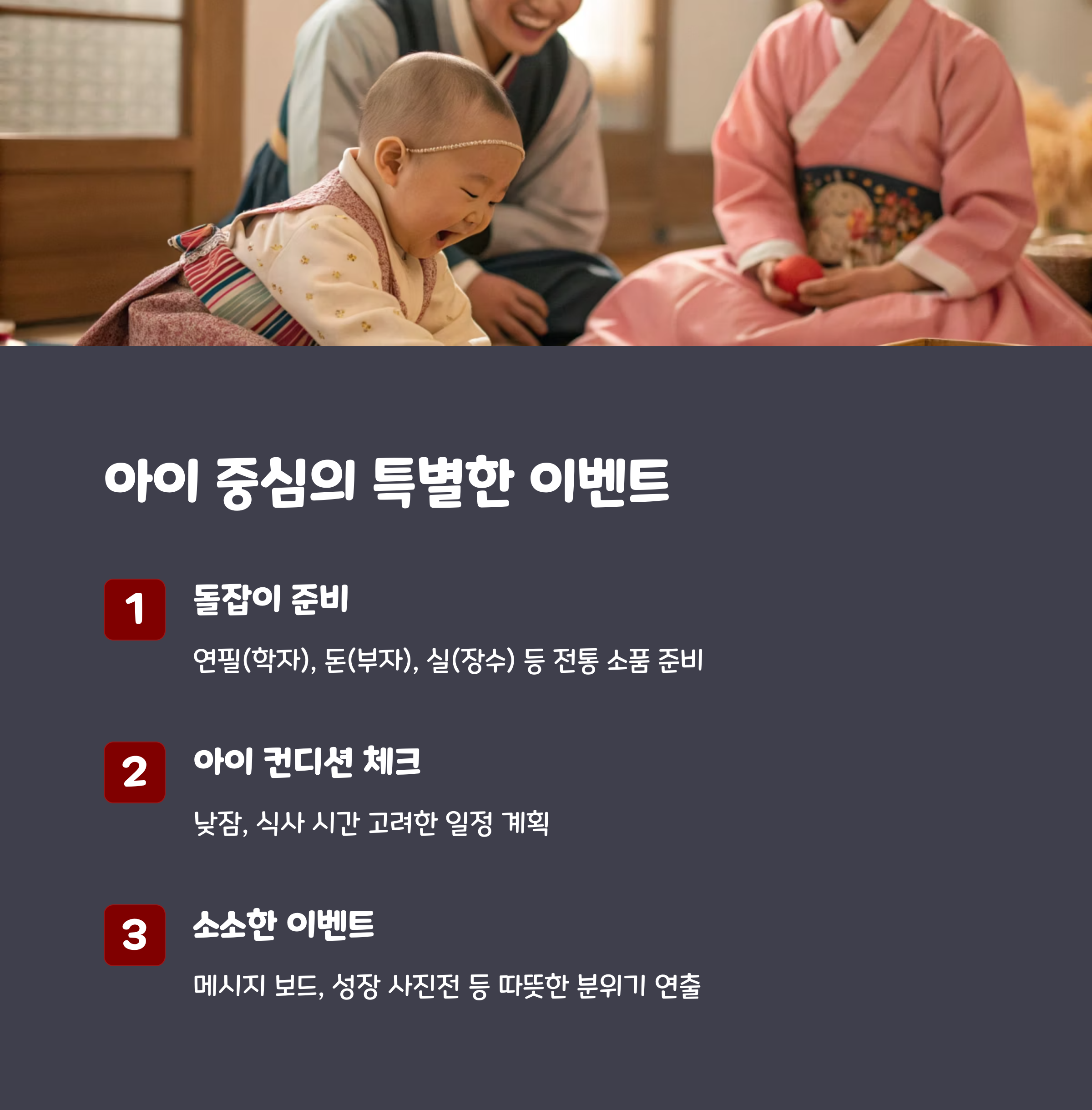| 돌잔치 준비 | 장소, 돌상, 스냅 등 주요 항목 미리 파악 |