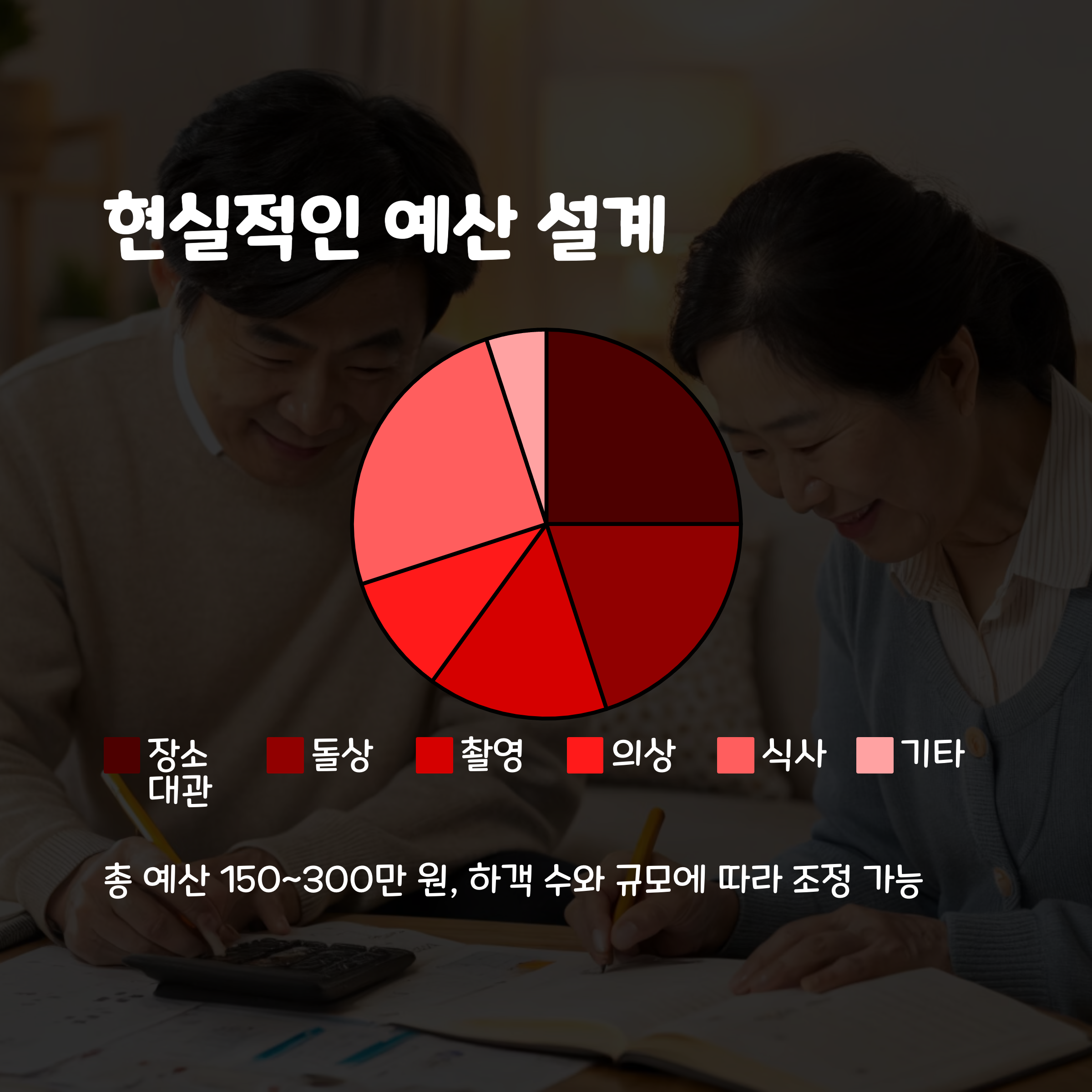 실제 비용을 살펴보면 장소 대관은 50만 원~100만 원대, 돌상은 대여 기준 30만 원~70만 원, 스냅 촬영은 20만 원~50만 원 선에서 진행되는 경우가 많습니다. 여기에 아기의 의상, 답례품, 케이크 등 부가 비용까지 포함하면 전체적으로 150만 원에서 많게는 300만 원까지 소요됩니다. 하지만 하객 수나 선물 품목에 따라 이보다 낮거나 높은 비용이 발생할 수 있으니, 꼭 맞춤형 예산을 작성해보세요.