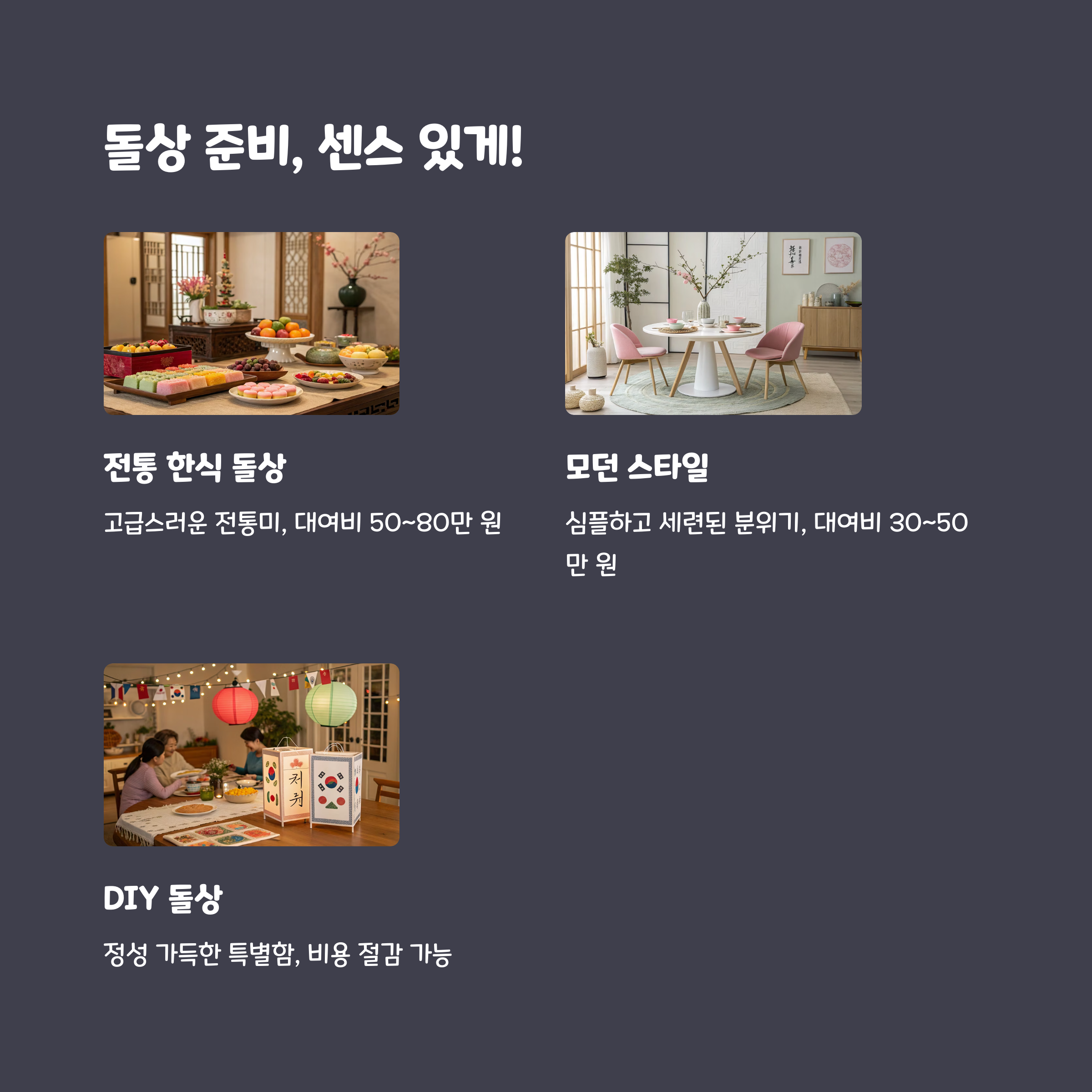 | 장소, 돌상, 촬영, 의상, 답례품 등 목록화 | 평균 비용 비교 및 절약 팁 제공 | 직접 진행한 후기 및 느낀점 공유 |