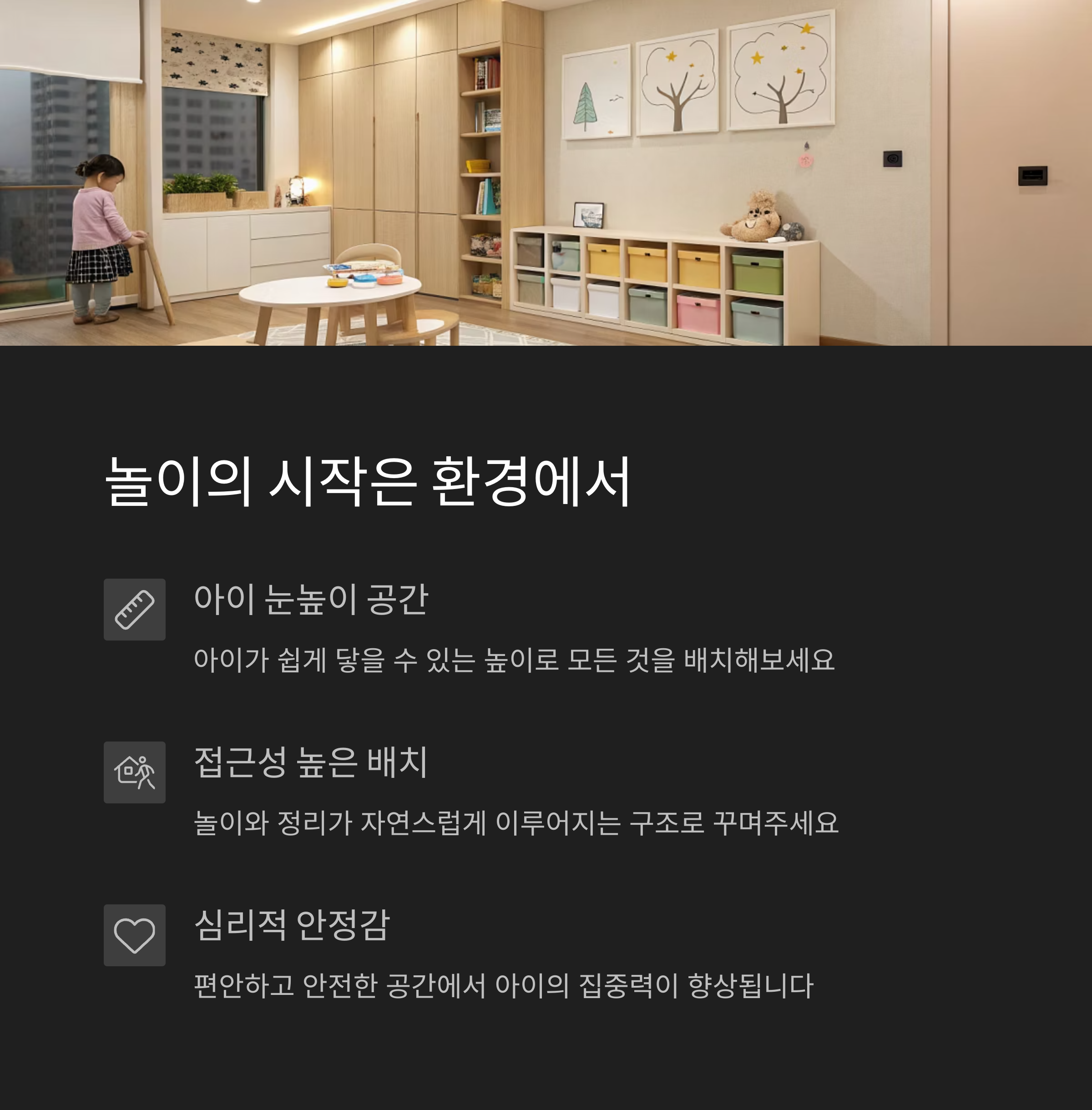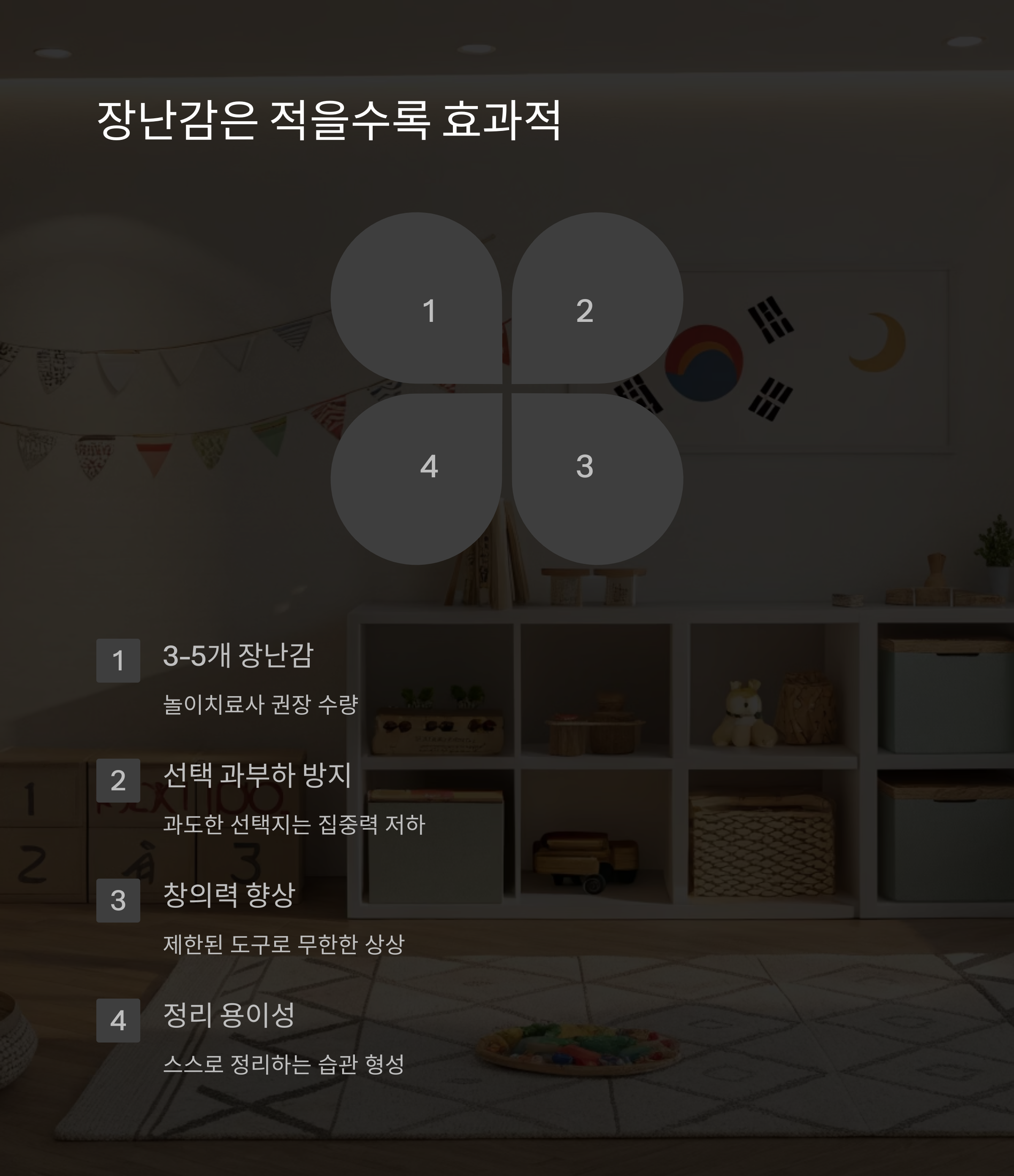 | 아이 눈높이에 맞춘 구조화된 공간이 중요합니다. | 정해진 시간과 방식의 놀이 루틴을 만들어요. | 너무 많은 장난감은 오히려 방해 요소가 됩니다. |