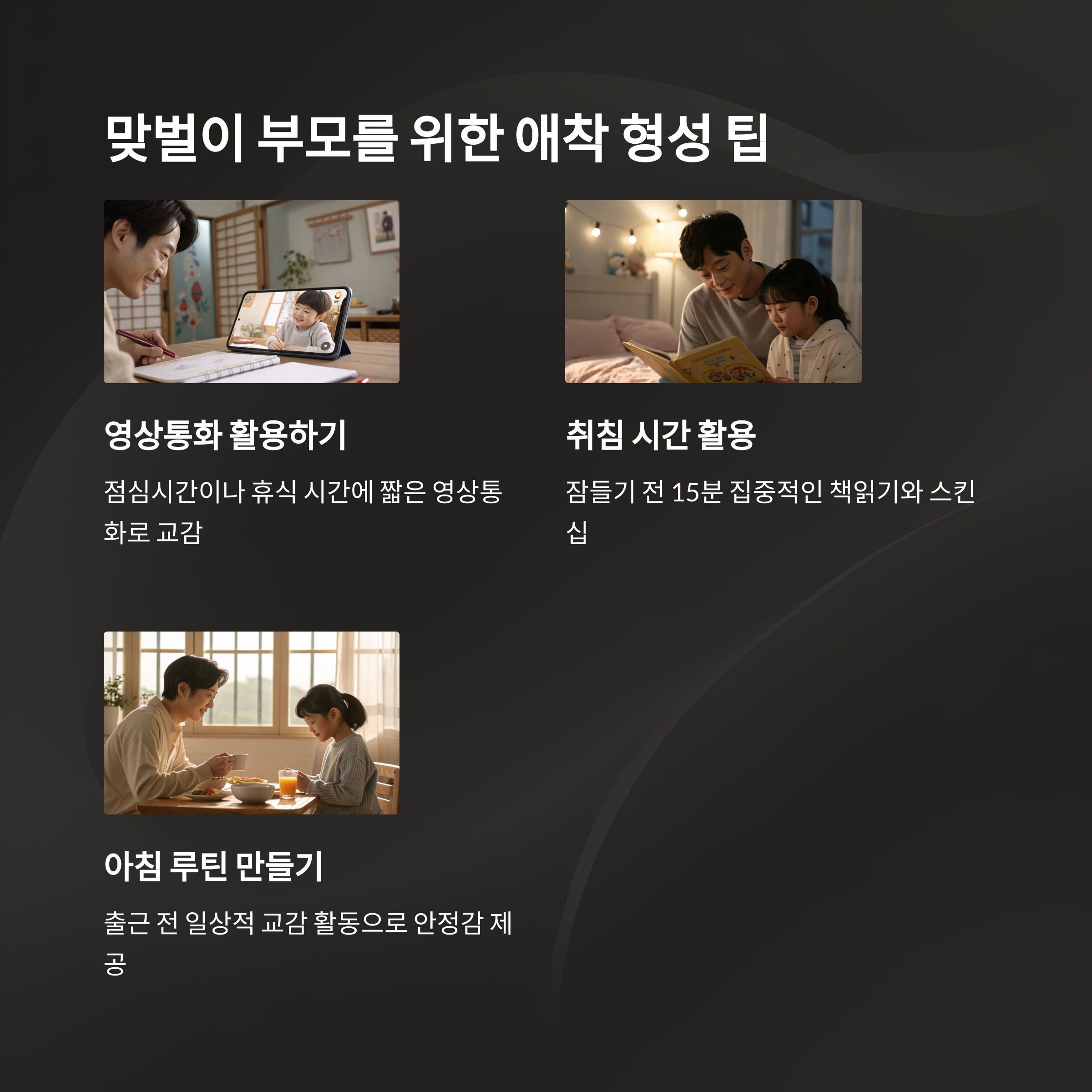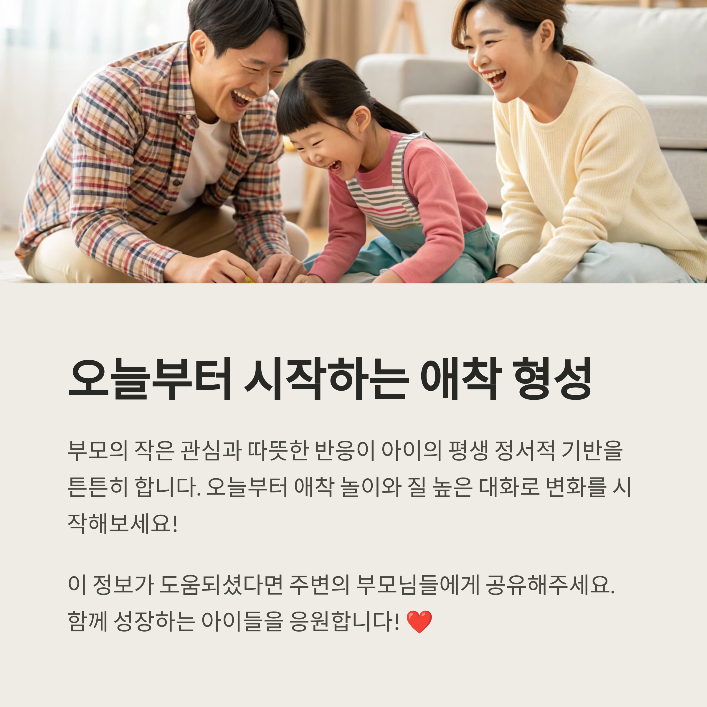 | 생후 6개월부터 만 3세까지가 핵심 시기 | 눈맞춤, 미소, 포옹 등으로 안정감 전달 | 예측 가능한 부모의 반응이 정서 안정의 핵심 |