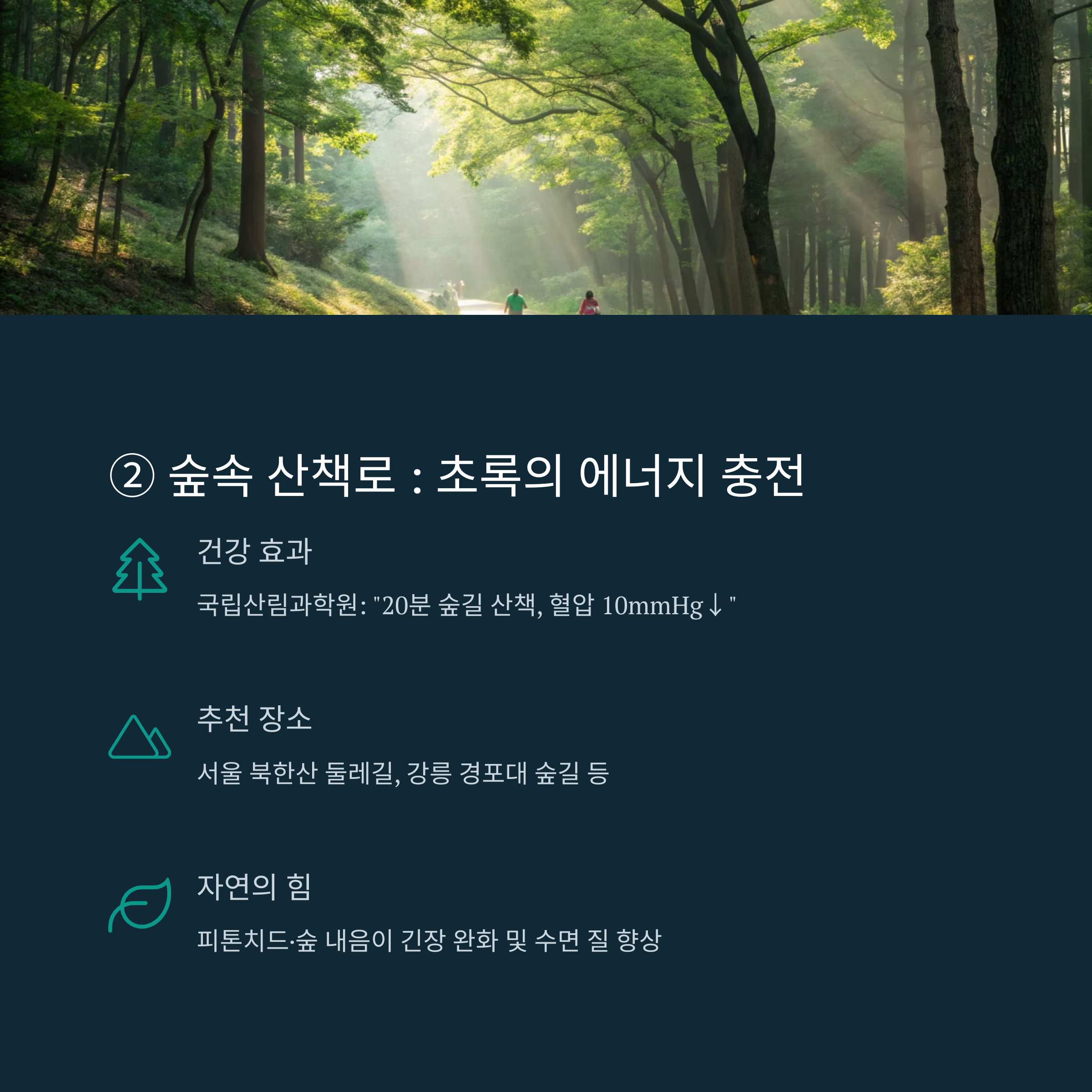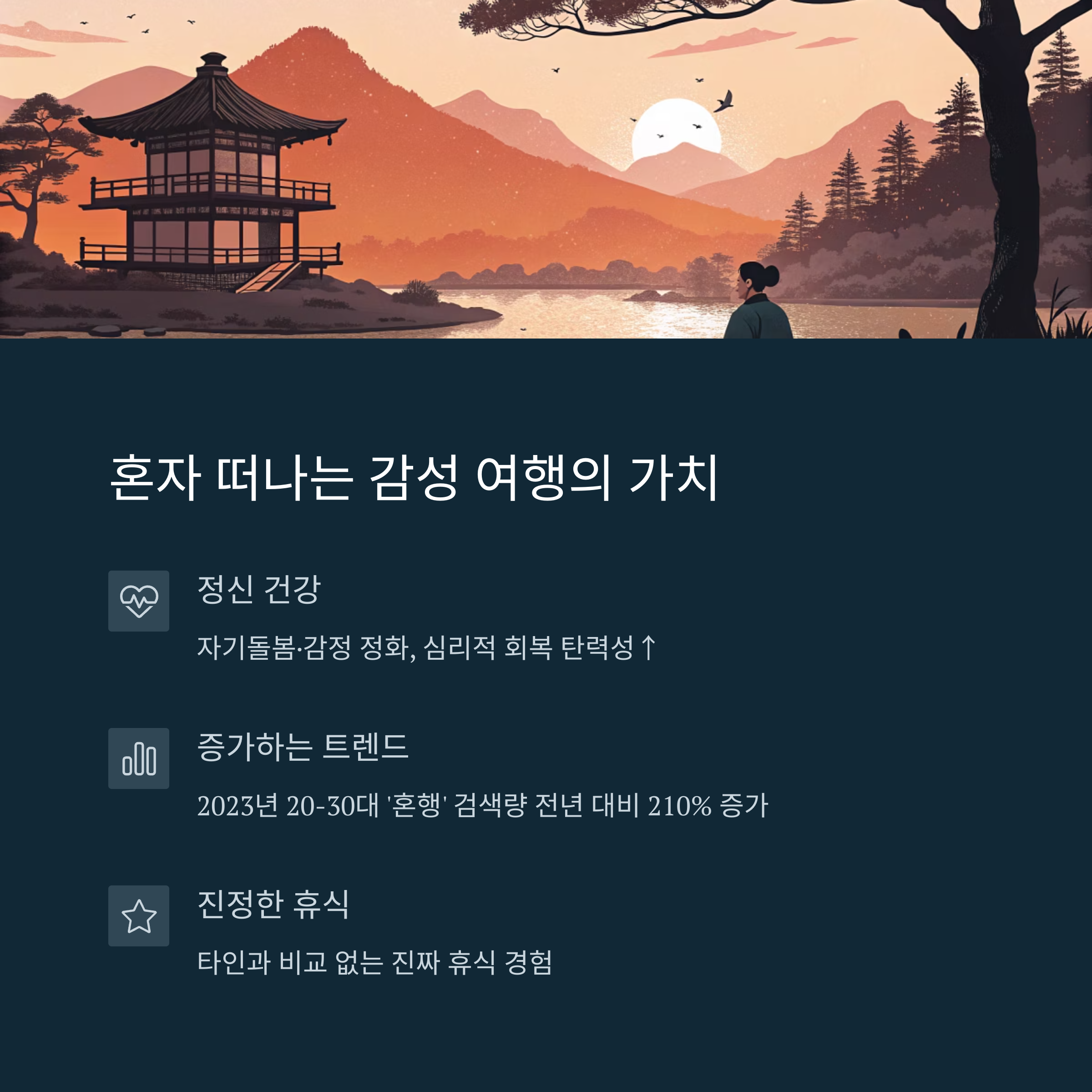 | 마음 치유 여행 | 자연과 감성 속에서 마음을 치유하는 여정입니다. |