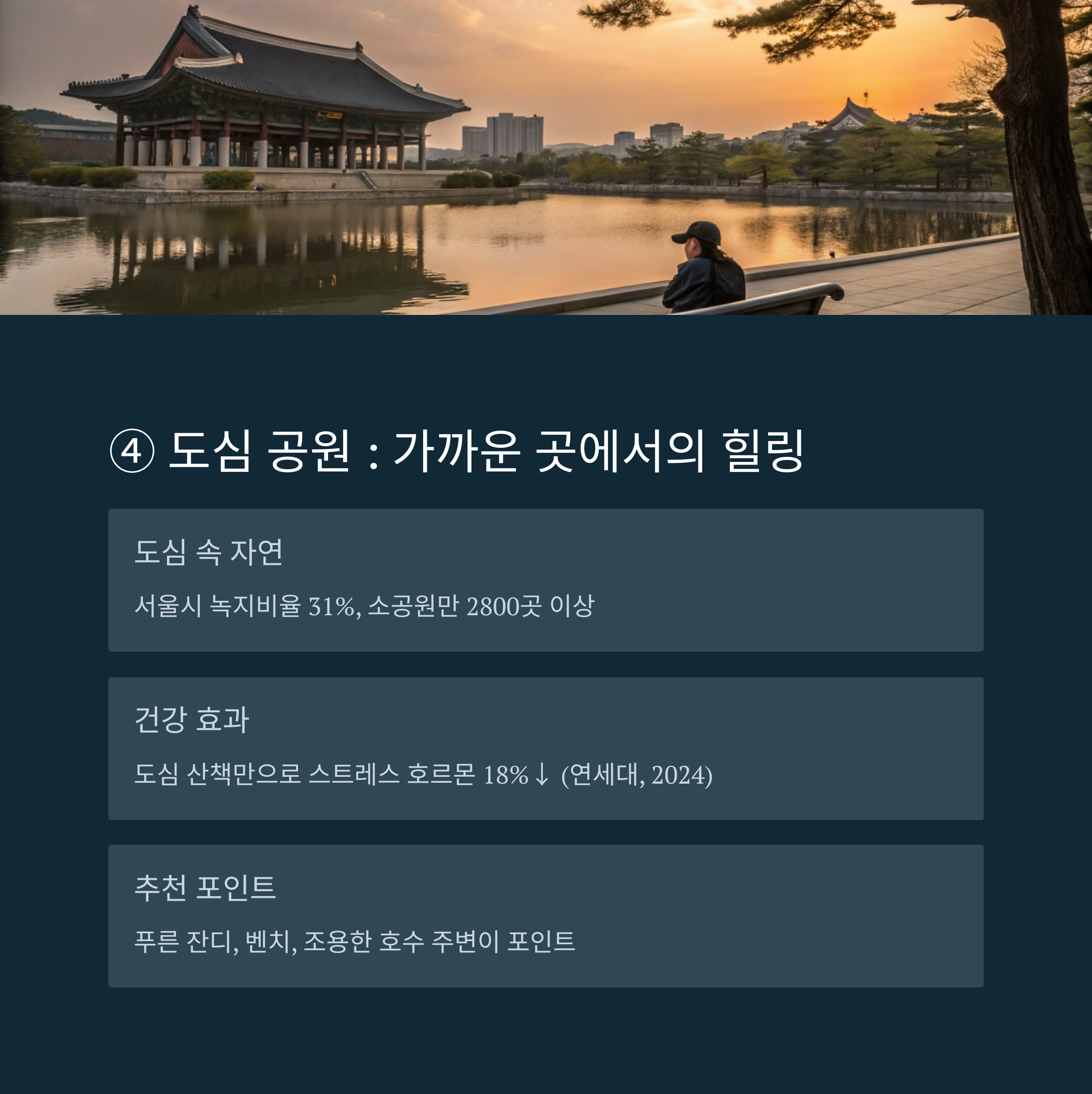 이런 감성 힐링 장소는 누구나의 삶에 필요합니다. 때로는 멀리 가지 않아도 좋습니다. 도심 속 공원 한편, 아늑한 동네 카페, 또는 집 앞 작은 산책로도 우리의 마음을 어루만지는 힐링 공간이 될 수 있습니다. 중요한 것은 외형이 아니라 그 공간에서 나와 마주하는 시간입니다. 그 자체가 감성 힐링이고, 진정한 나를 회복하는 과정이기 때문입니다.