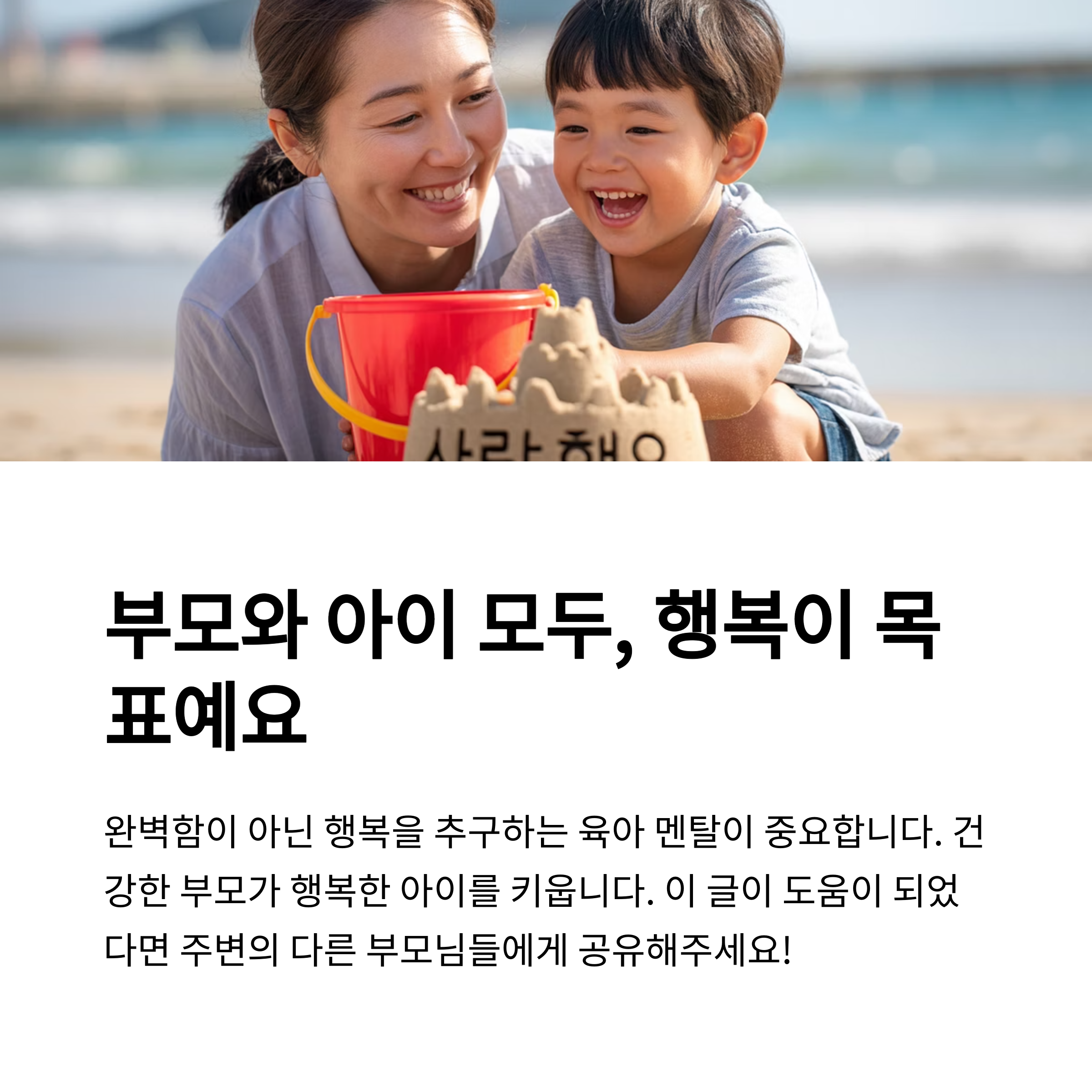 육아는 단순한 돌봄이 아니라, 아이와 함께 성장해 나가는 과정입니다. 완벽하지 않아도 괜찮고, 실수해도 괜찮습니다. 중요한 것은 매 순간 아이와 함께하려는 진심과 나를 잃지 않으려는 노력입니다. 오늘 하루가 조금 힘들었다면, 내일은 조금 더 가벼운 마음으로 다시 시작해 보세요. 우리 모두가 충분히 잘하고 있고, 그 자체로 이미 훌륭한 부모입니다.