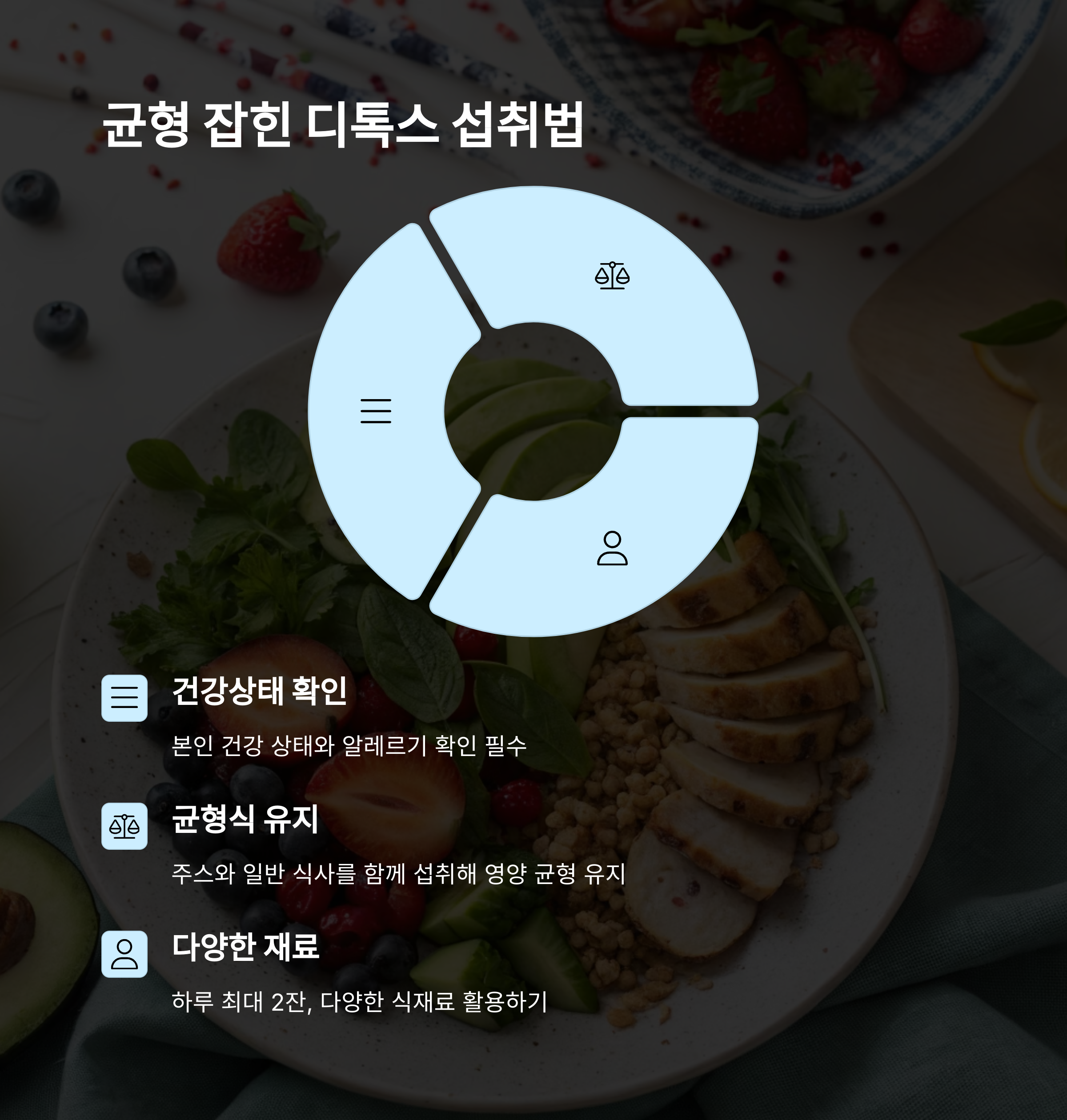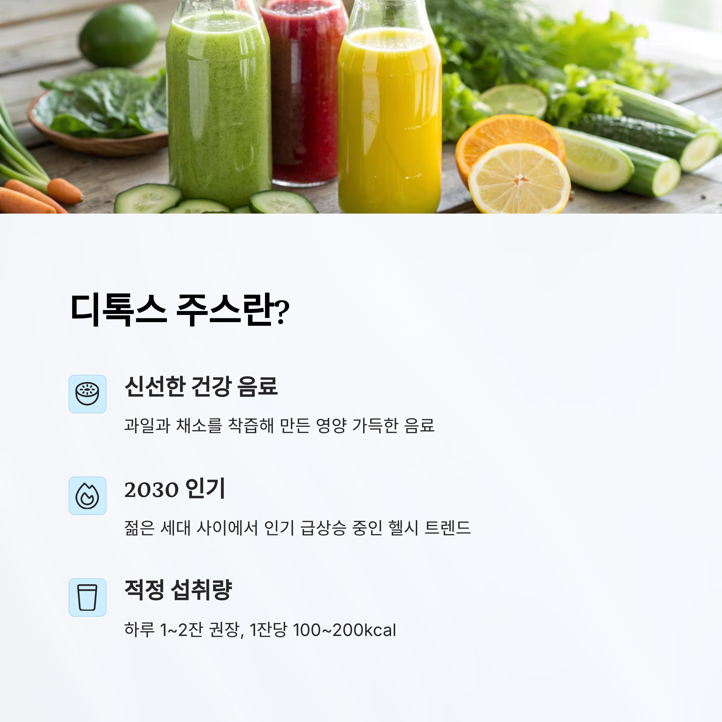 | 디톡스 주스란? | 과일·채소로 만든 해독 목적의 건강 음료입니다. |