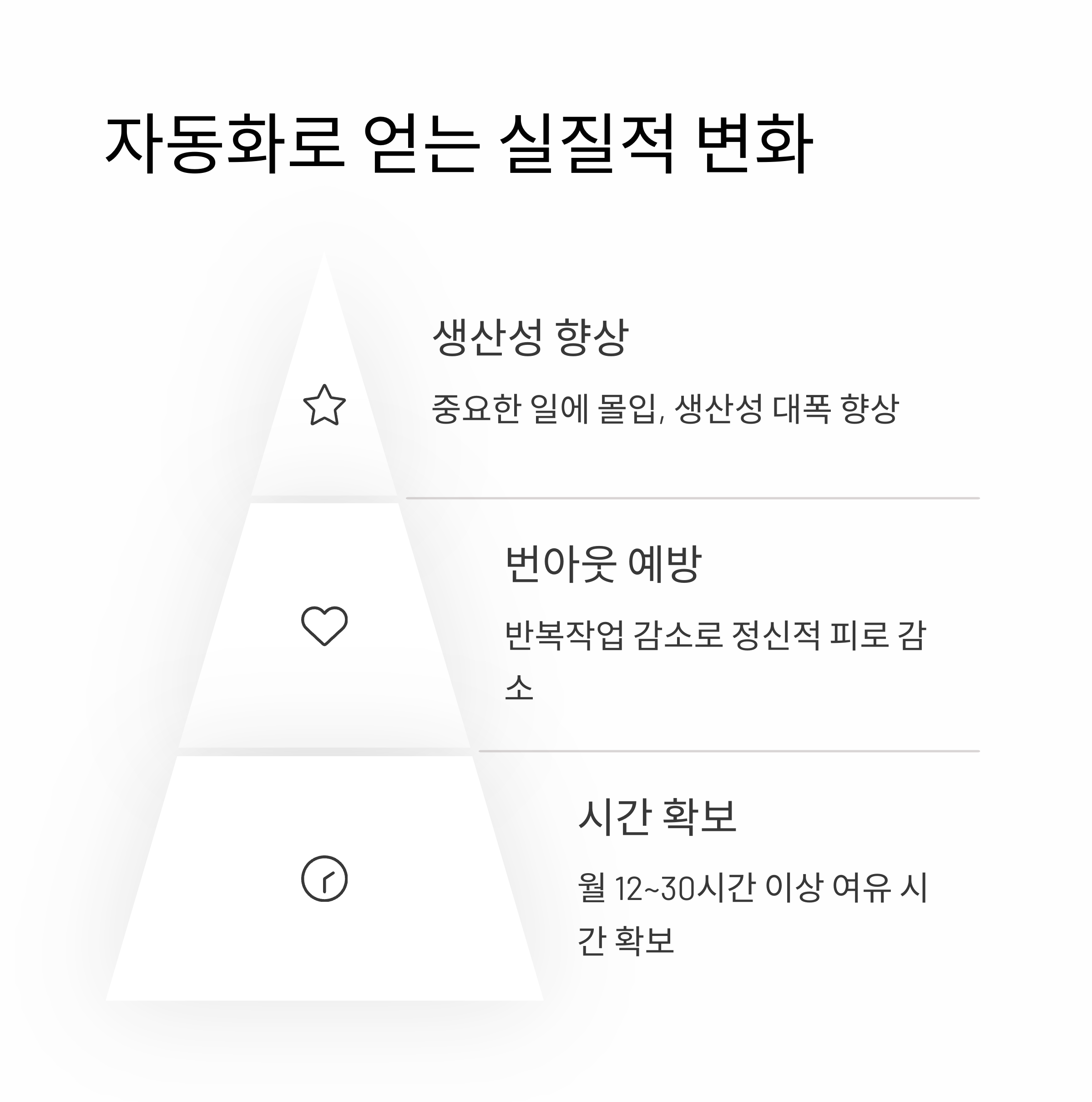 | 다양한 조건 설정으로 작업을 자동 처리 | 하루 10분 이상의 여유 시간 확보 가능 | 반복 작업을 최소화하여 루틴 정착 |