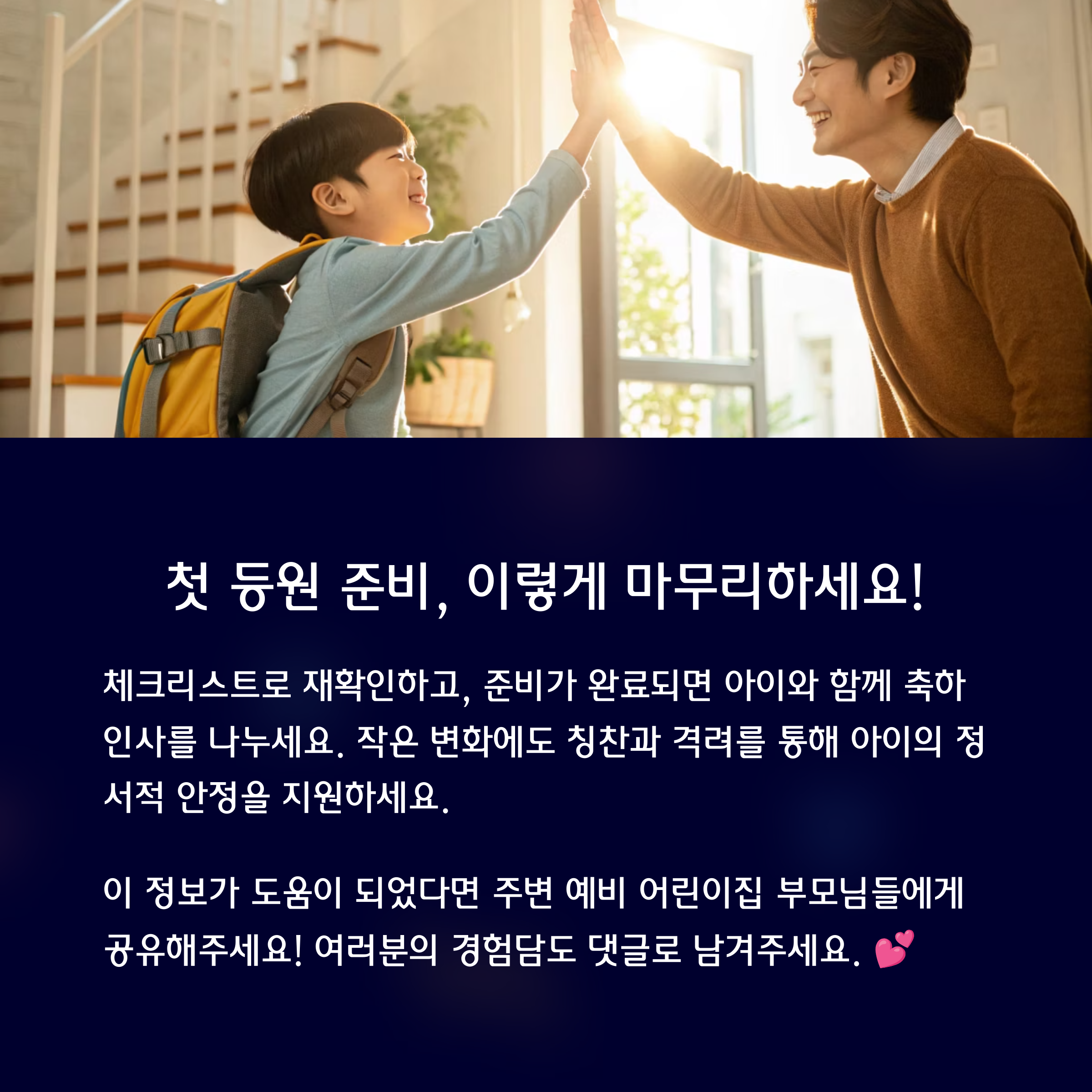 아이의 첫 사회생활, 어린이집은 부모에게도 아이에게도 아주 큰 도전입니다. 하지만 철저한 준비와 따뜻한 마음만 있다면 그 시작은 결코 어렵지 않습니다. 오늘 알려드린 준비물 체크리스트와 적응 팁을 바탕으로, 아이가 밝은 웃음으로 첫날을 맞이하길 바랍니다. 매일의 변화 속에서도 아이는 놀라운 속도로 성장합니다. 부모님도 이 여정을 함께하며 더욱 단단해지실 거예요. 모두의 첫 등원을 진심으로 응원합니다.