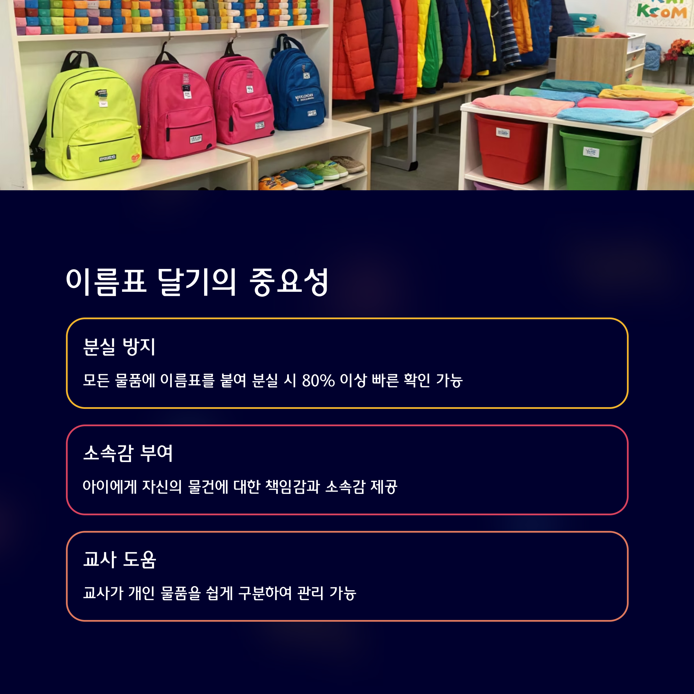 | 미리미리 체크리스트를 활용하면 좋아요. | 스티커, 네임펜, 자수 모두 유용해요. | 부모의 태도가 아이의 정서에 큰 영향을 줘요. |
