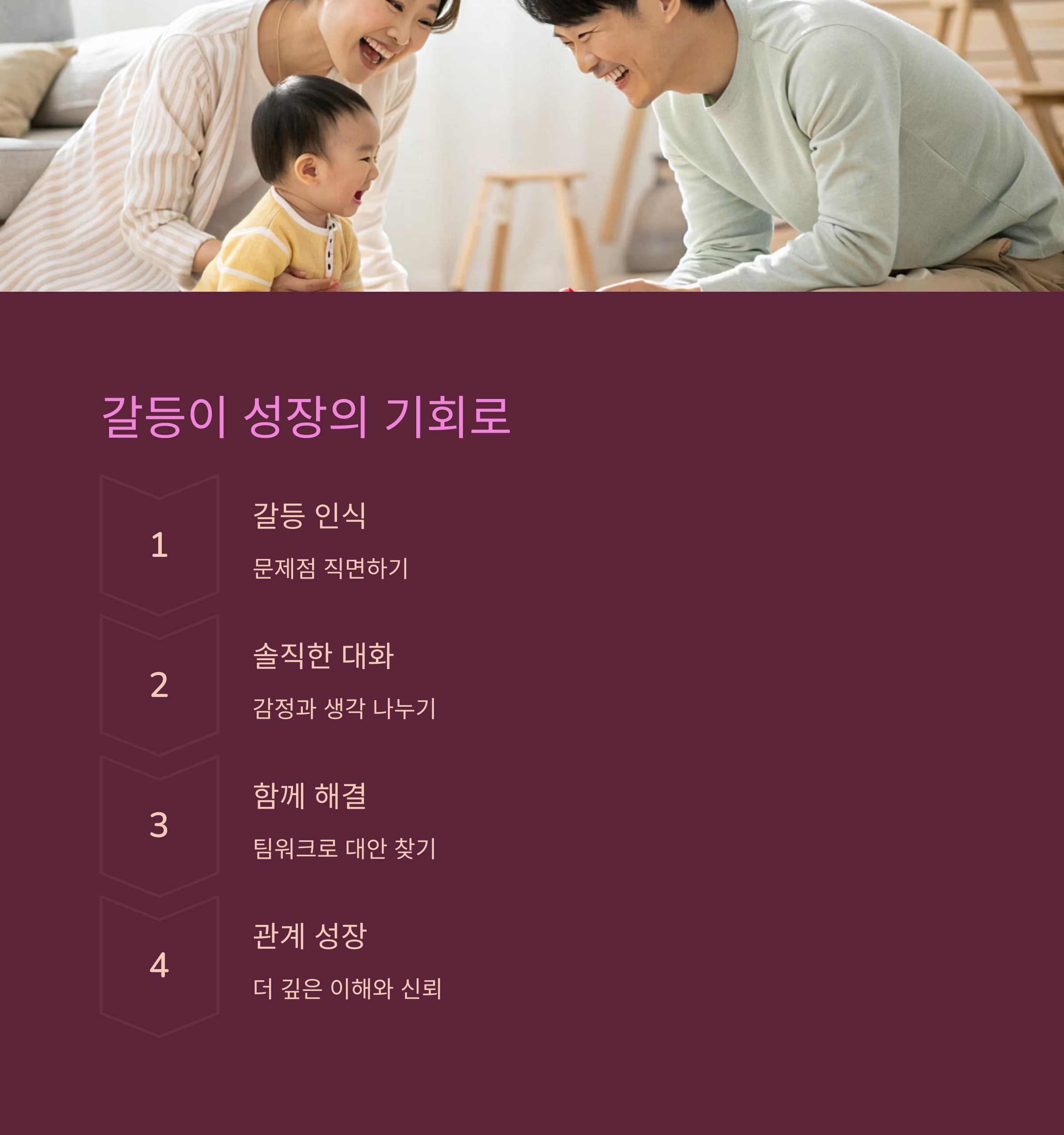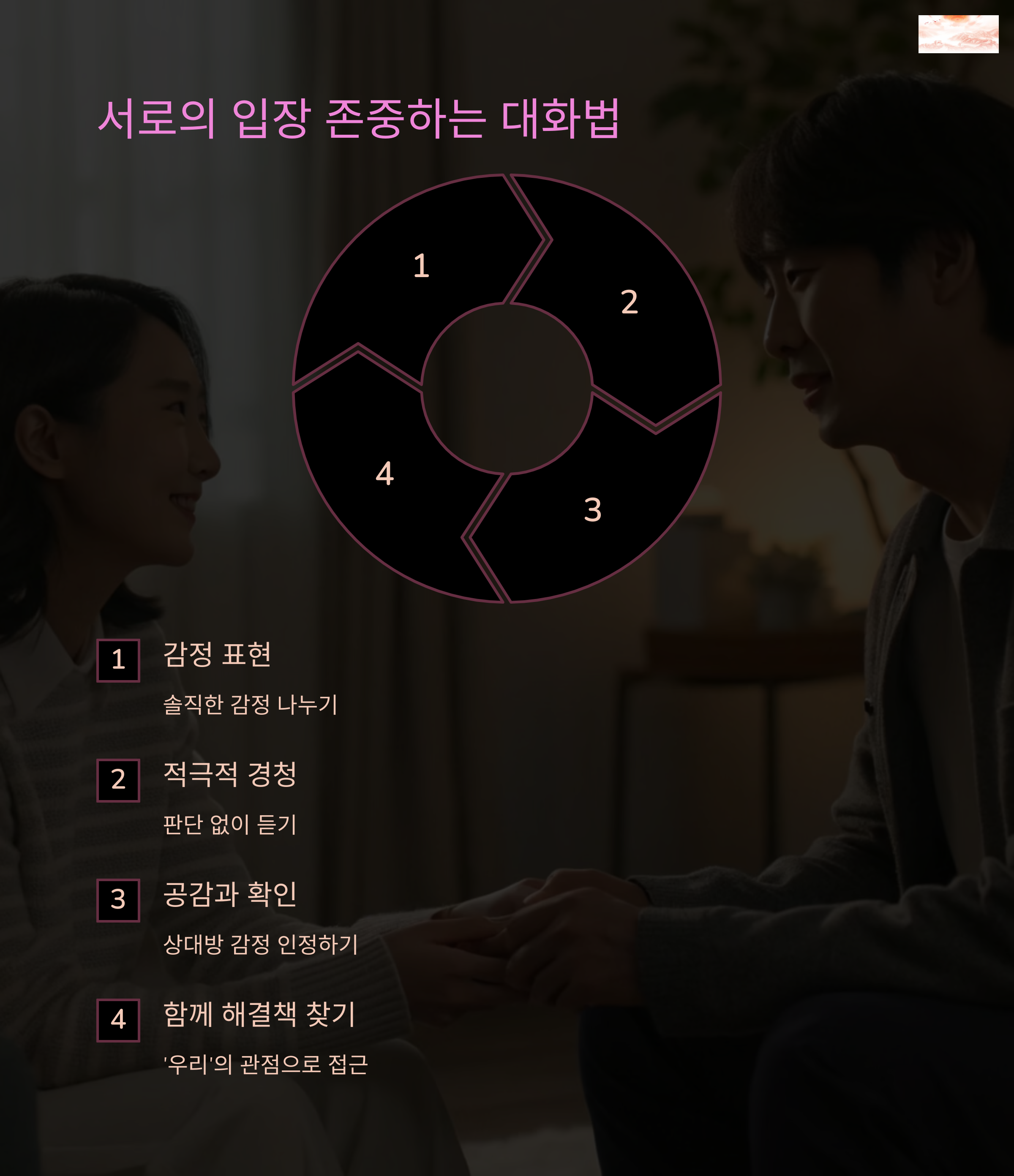 | 서로의 노력과 이해가 필수 | 상대 입장을 인정하는 말투 | 감정 공유 시간이 신뢰 회복의 기회 |