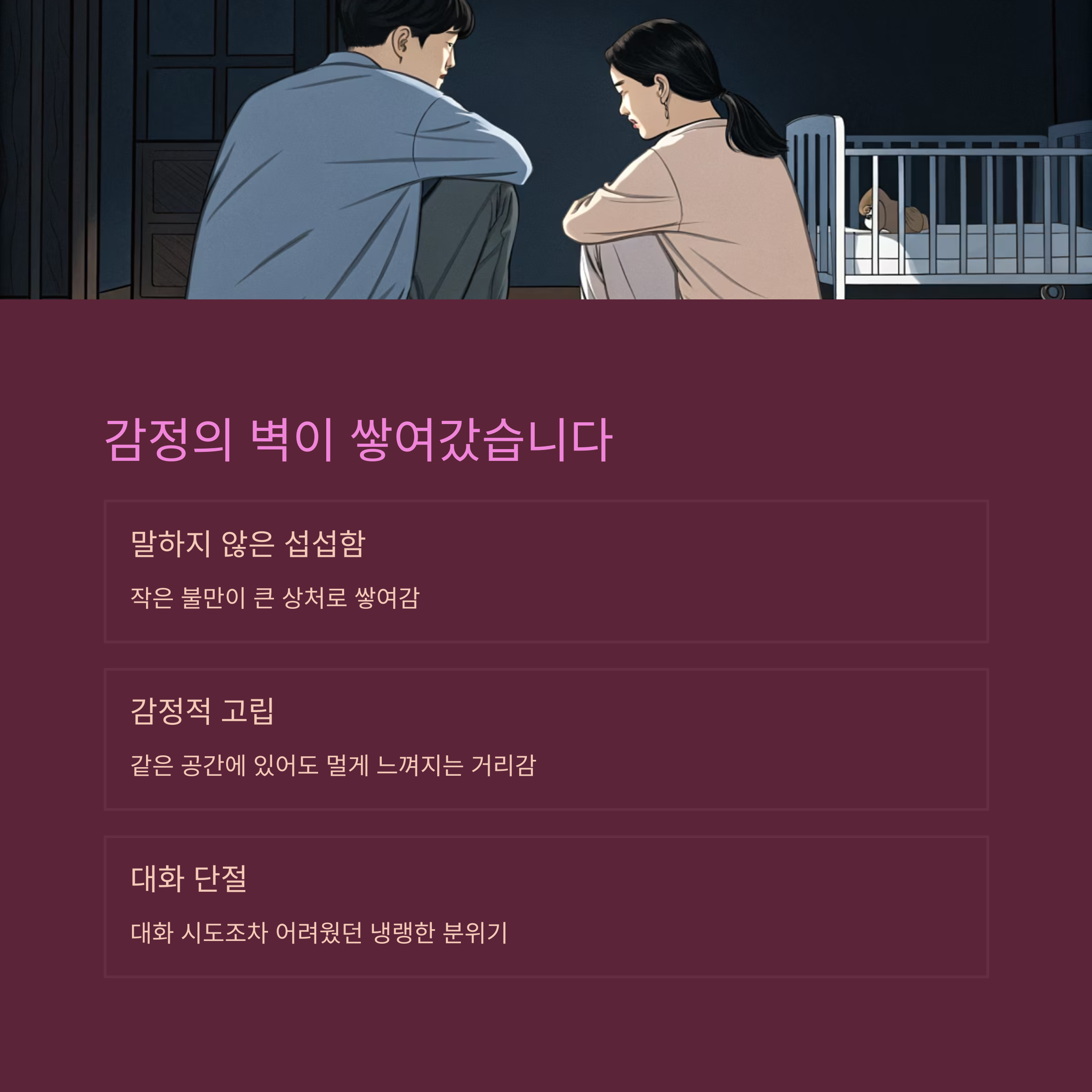 | 육아 스트레스 | 감정 표현 부족과 피로 누적으로 인한 갈등 |