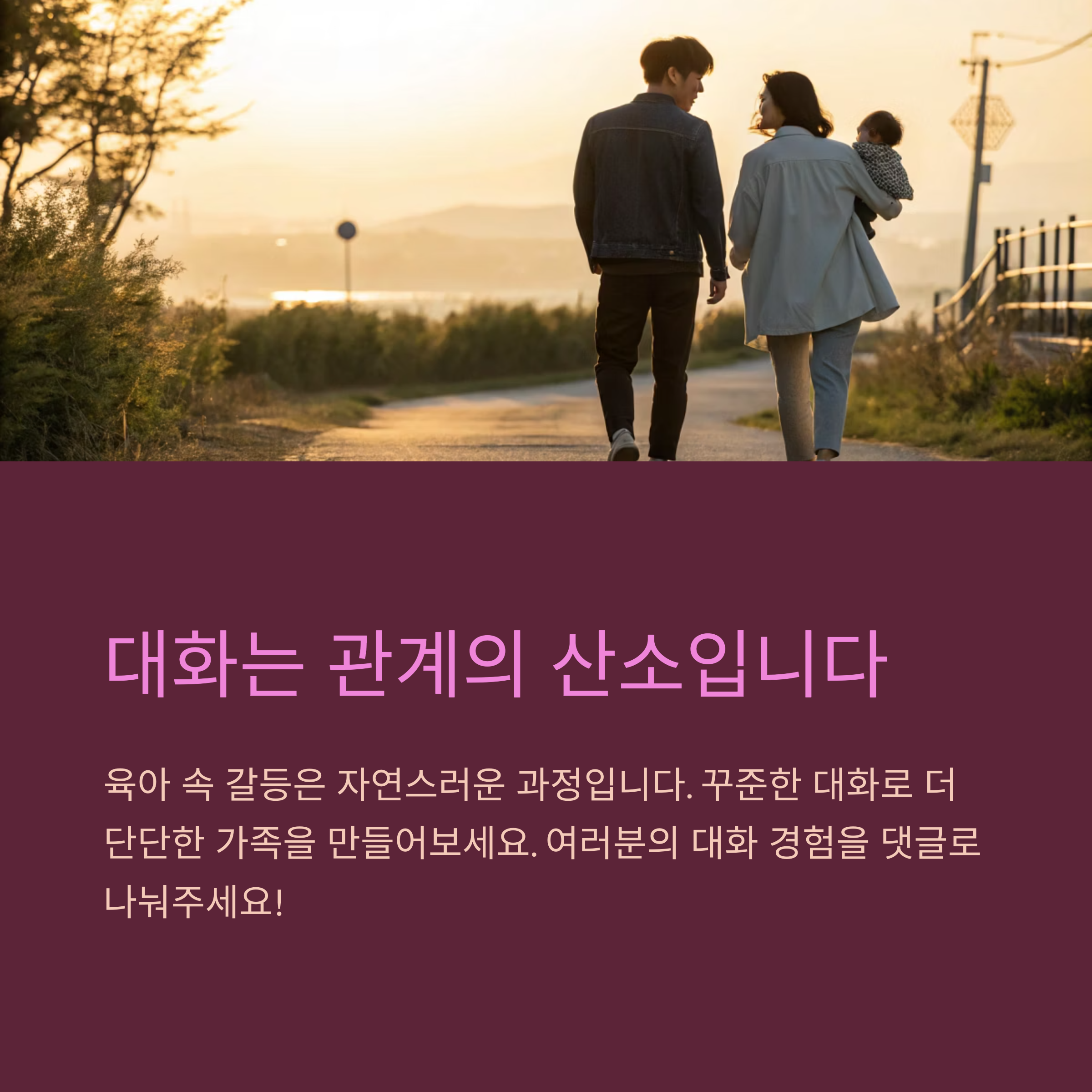 여러분은 육아로 인한 갈등을 어떻게 풀고 계신가요? 혹은 아직 해결되지 않은 고민이 있으신가요? 댓글로 경험을 나눠주시면 더 많은 공감과 도움을 주고받을 수 있습니다.