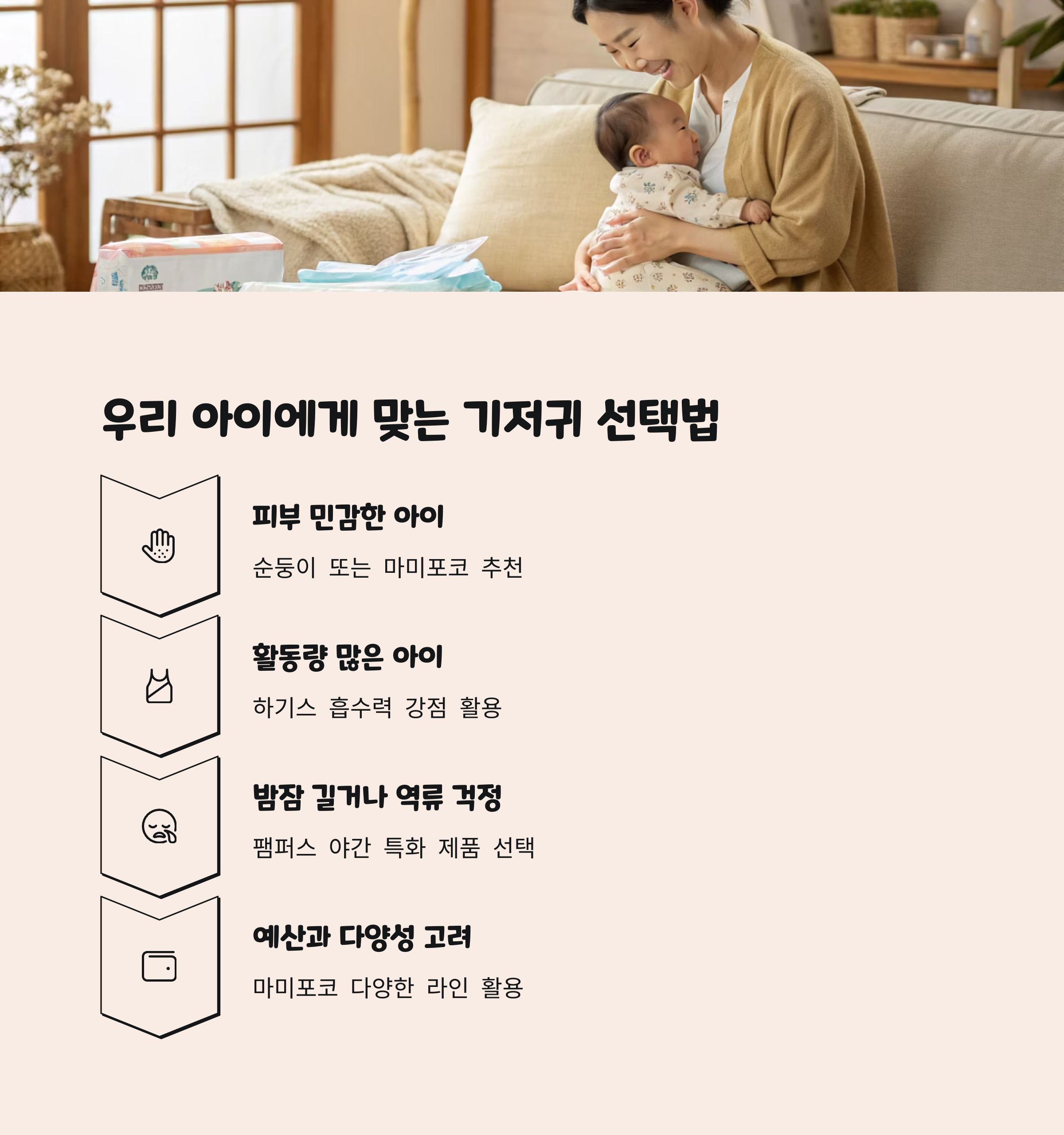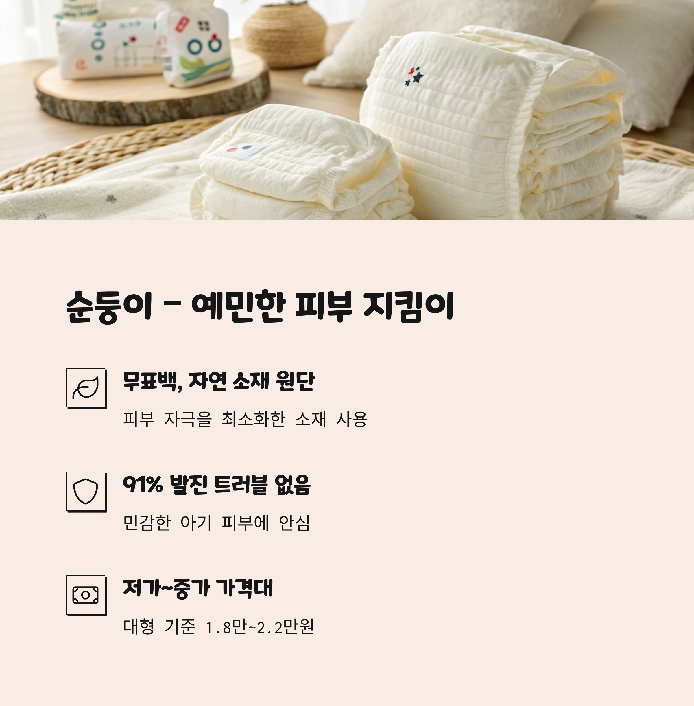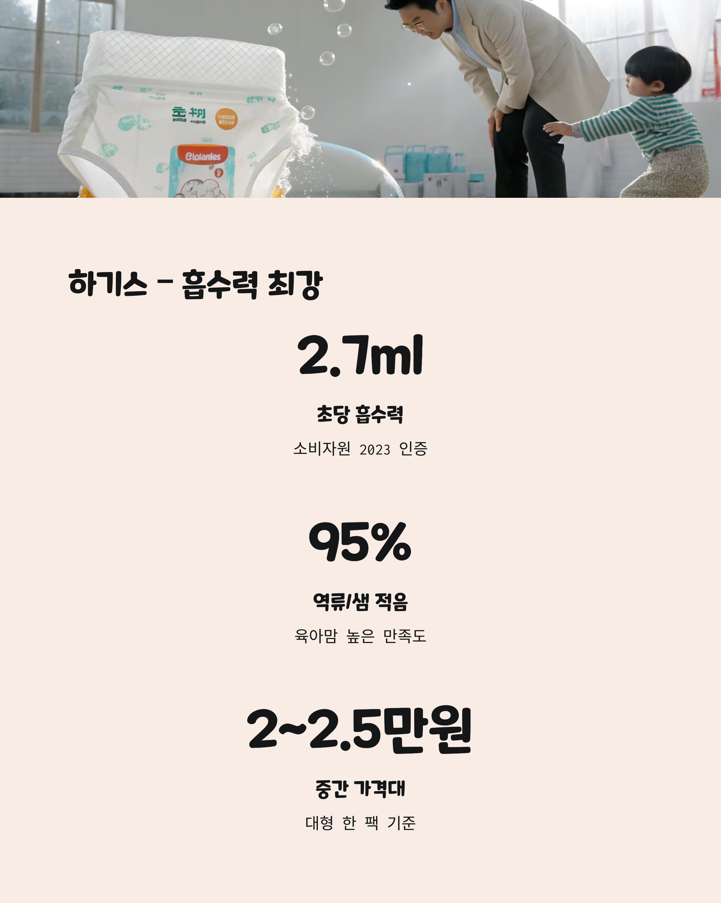 | 흡수력 | 아이가 오래 착용해도 새지 않는 흡수력 중요 |
