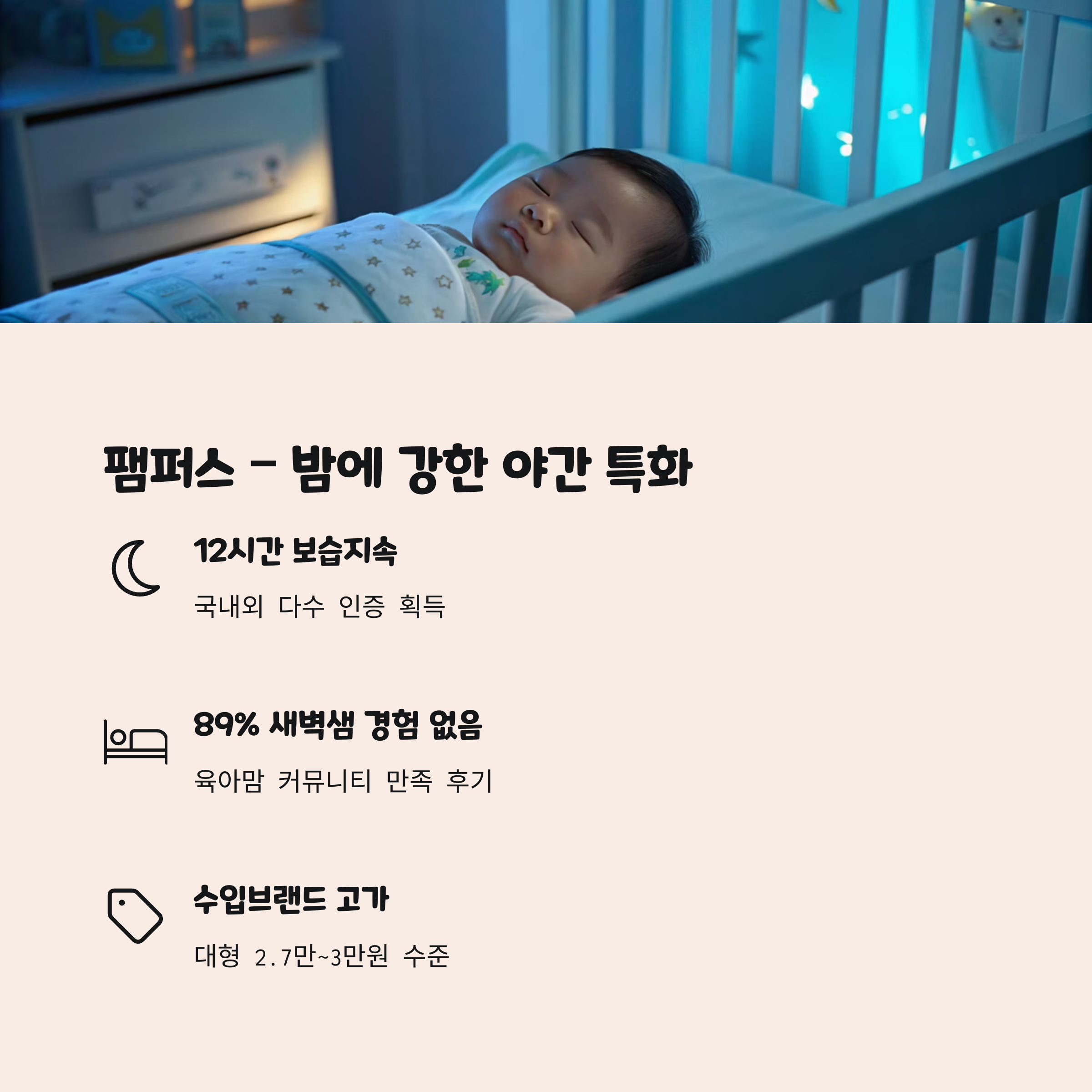 | 밤새 착용해도 새지 않는 브랜드 다수 | 순한 소재 사용으로 자극 최소화 | 고가와 중저가형 제품 혼재 |