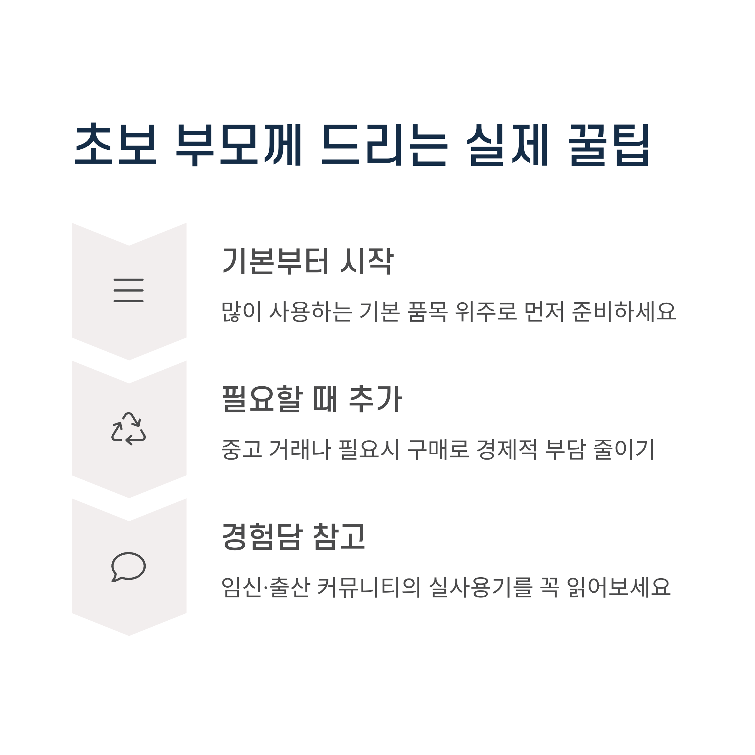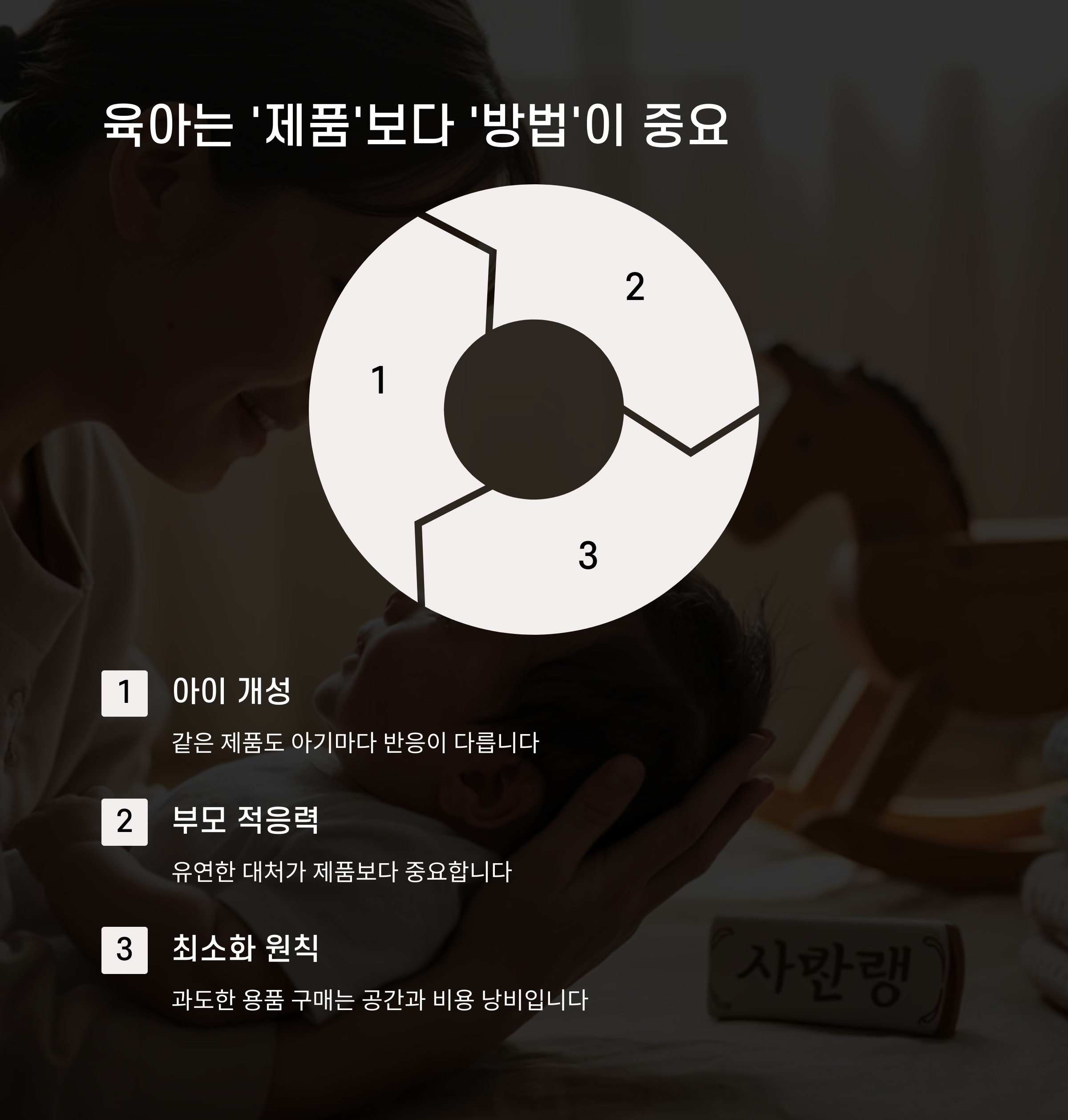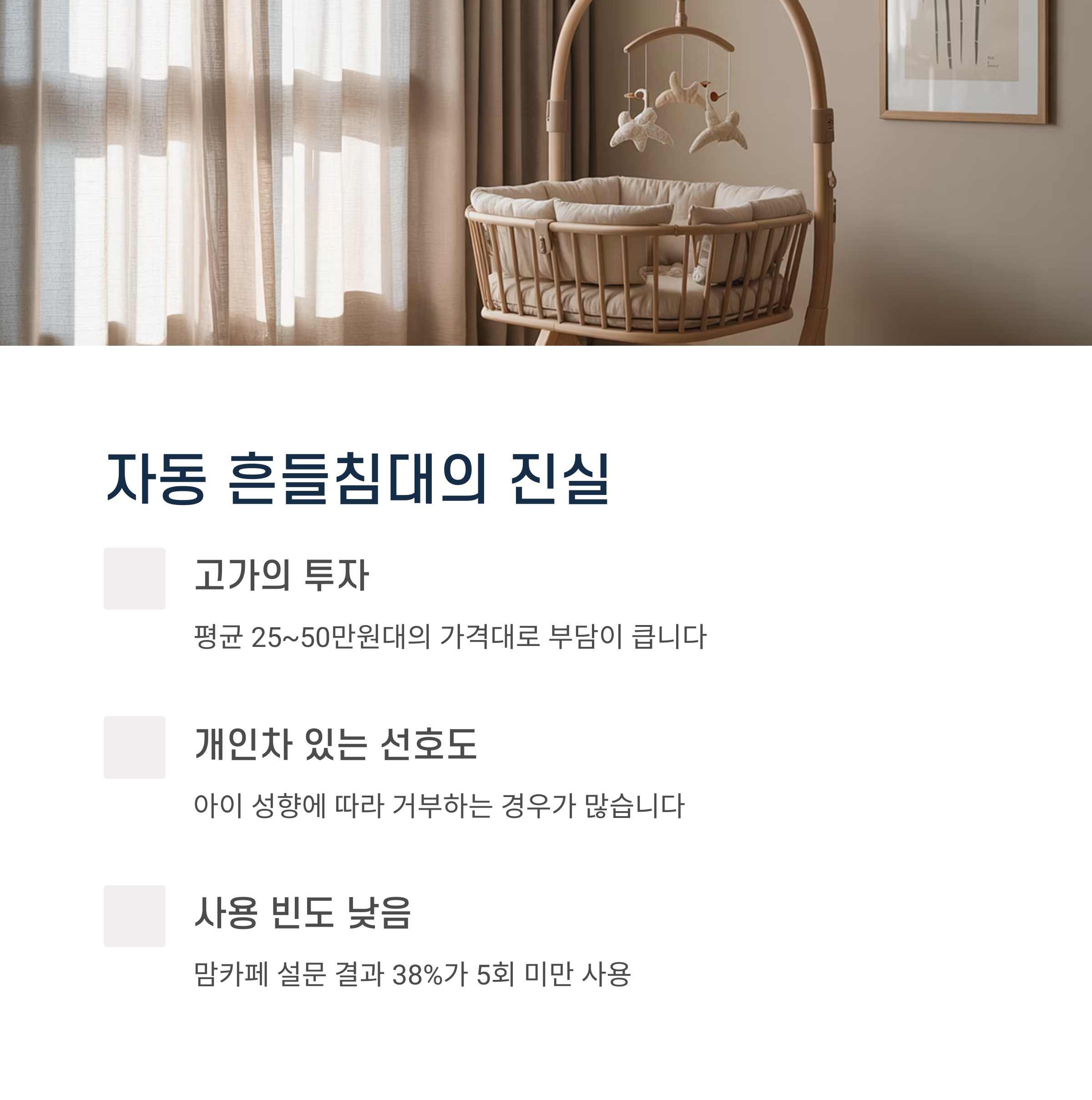 | 자동 흔들침대, 수유등, 기저귀통 | 다시 출산해도 사지 않을 용품들 | 사용 빈도 낮고 불편함 많음 |