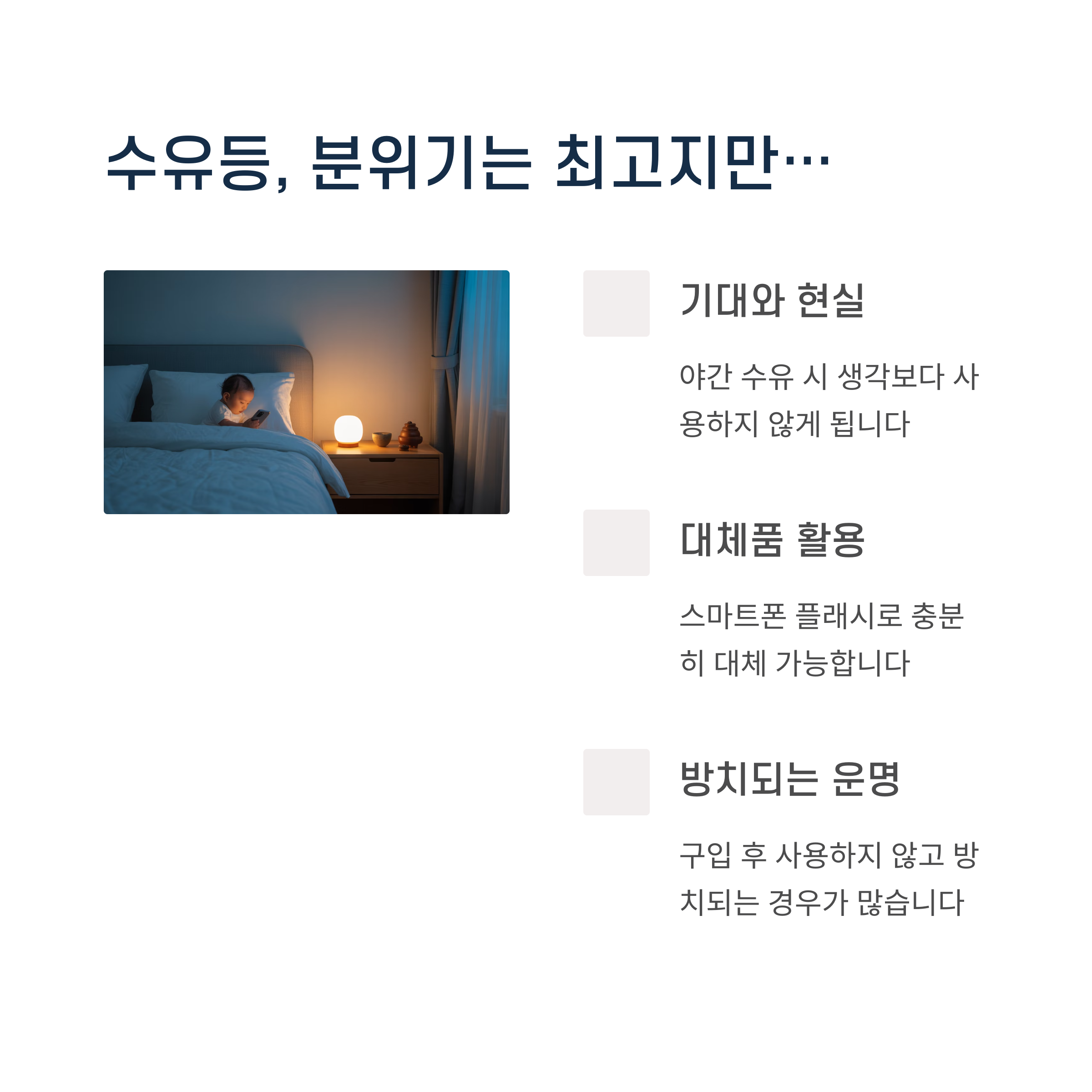 다음은 수유등입니다. 수유 시 밝기 조절이 가능해 밤중 수유에 좋다 하여 유명 브랜드 제품을 구매했지만, 실제 사용해 보니 밝기 차이도 크지 않고 결국 휴대폰 플래시나 기존 스탠드를 더 자주 썼습니다. 게다가 충전식이라 사용 중간에 배터리가 나가는 일이 많았고, 번거롭기만 했습니다. 결국 생활 속 실용성보다 비주얼에 끌려 샀던 선택이 후회로 남았습니다.